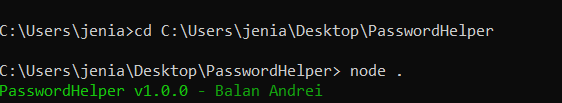 Rularea programului se face prin executarea fișierului PasswordHelper.bat sau prin Command Prompt astfel:
