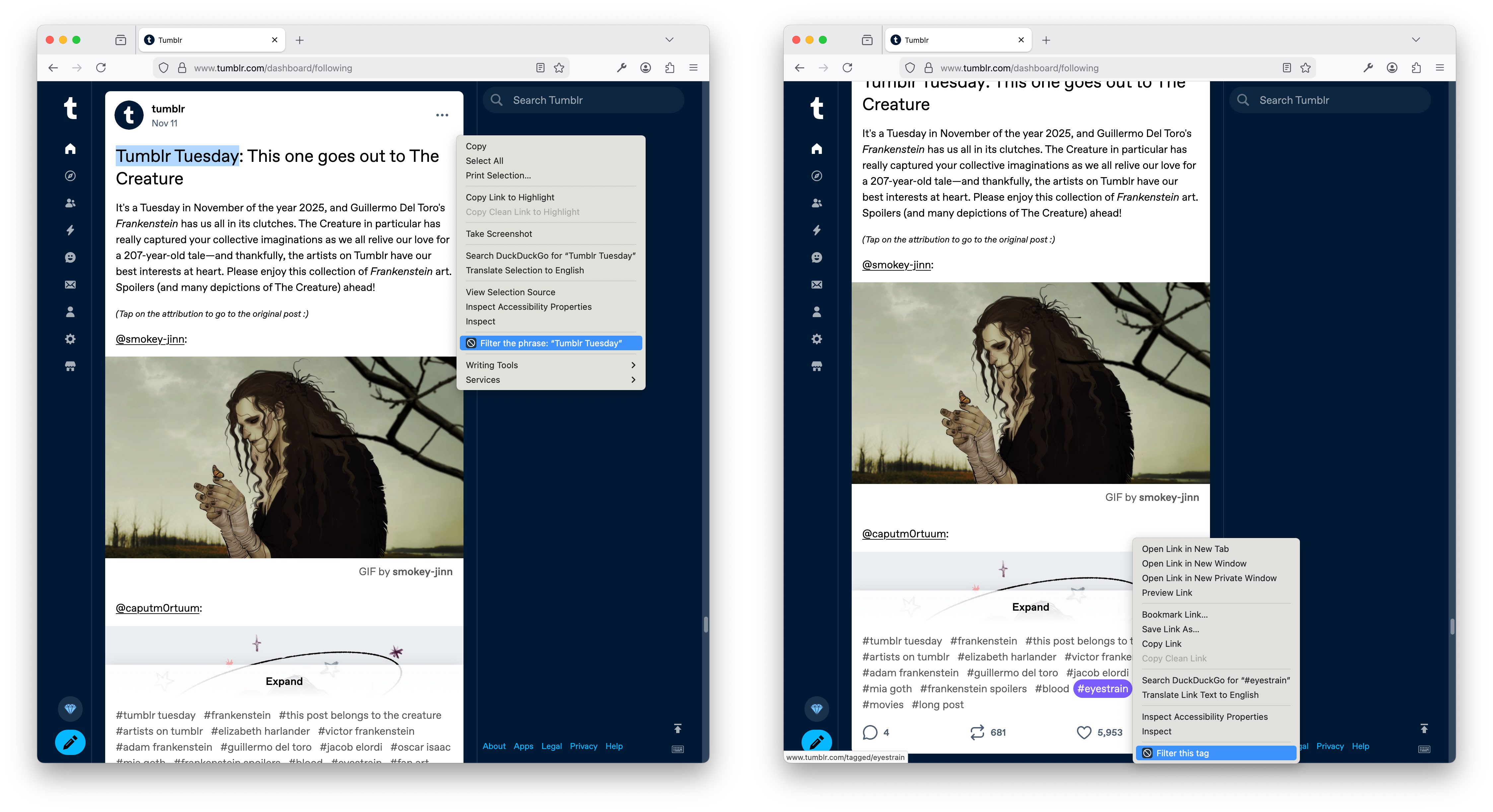 Right-click a tag link or a selected phrase to get an option to filter that tag or phrase.