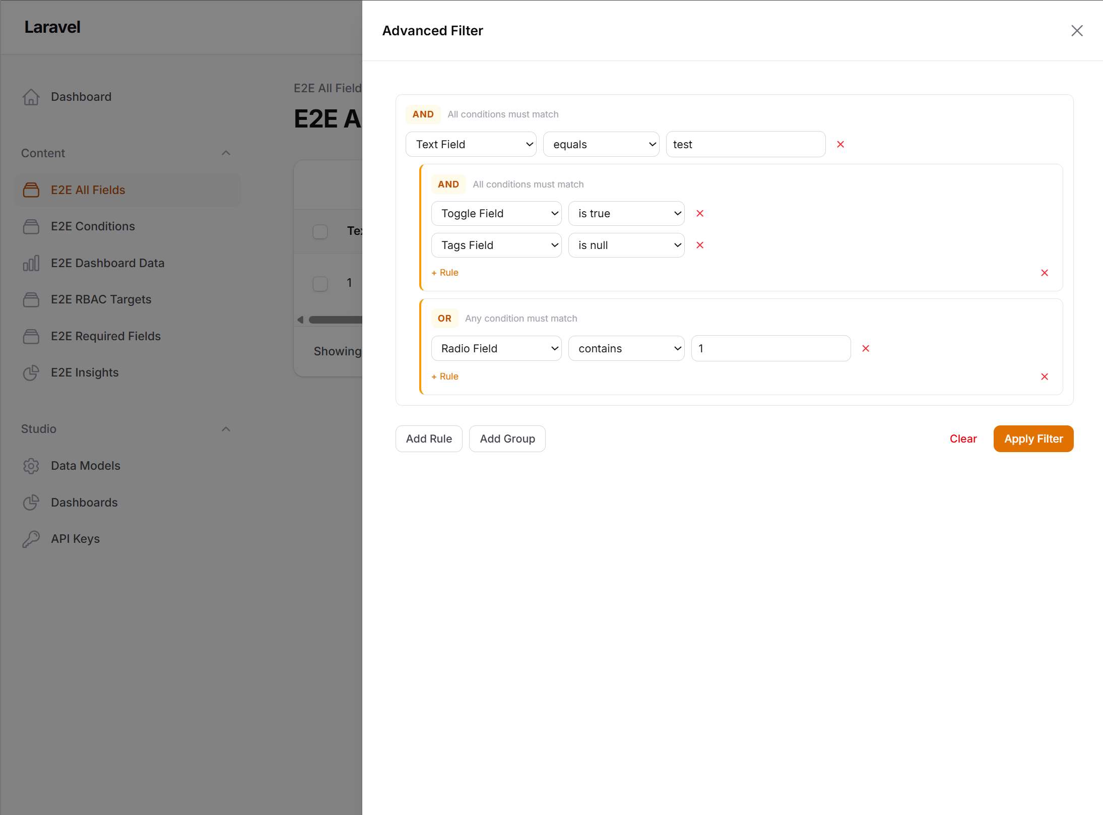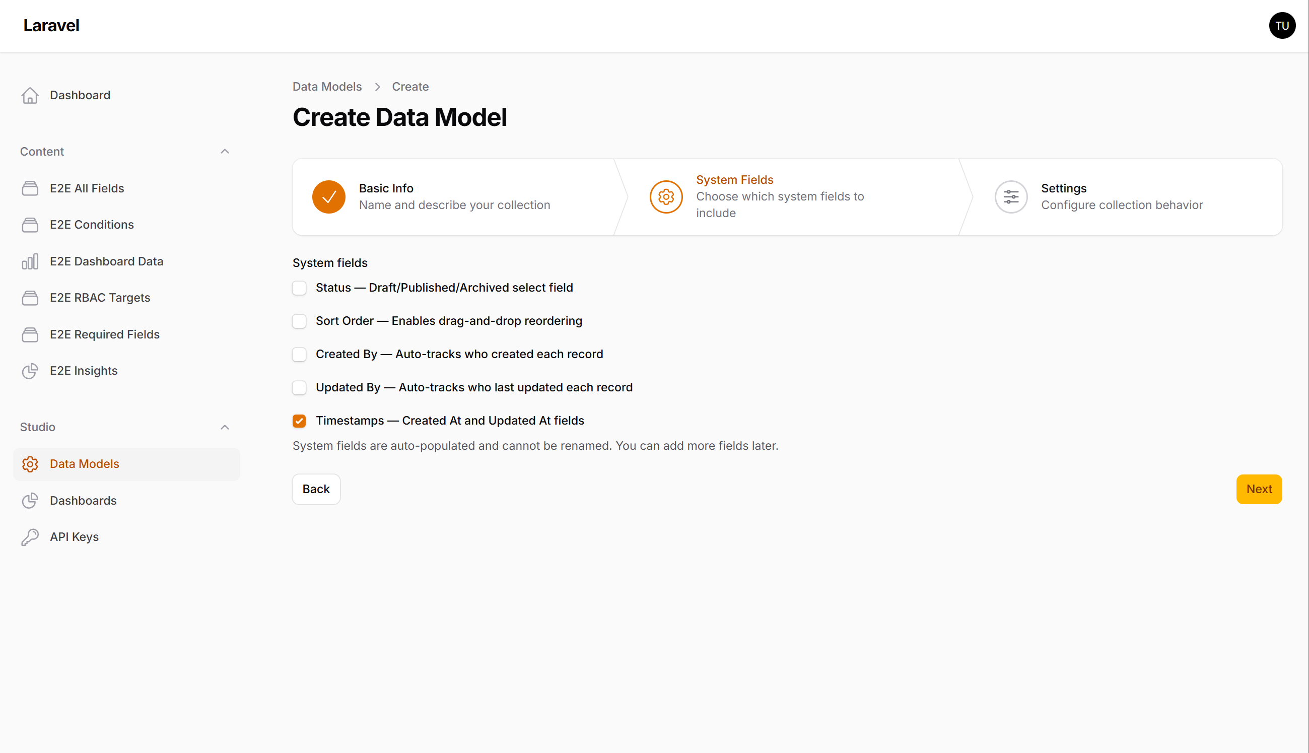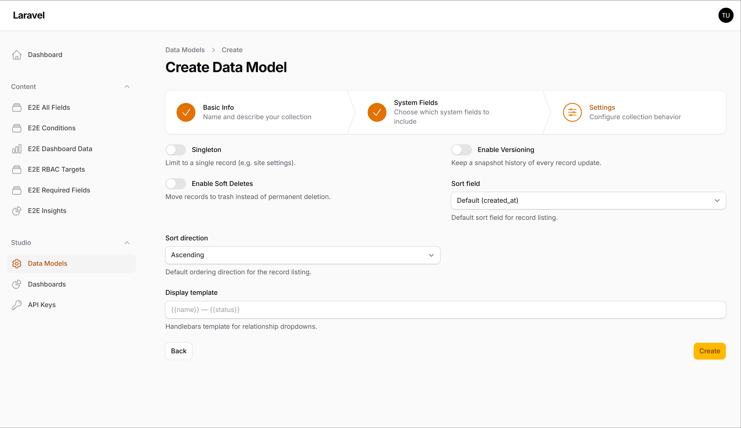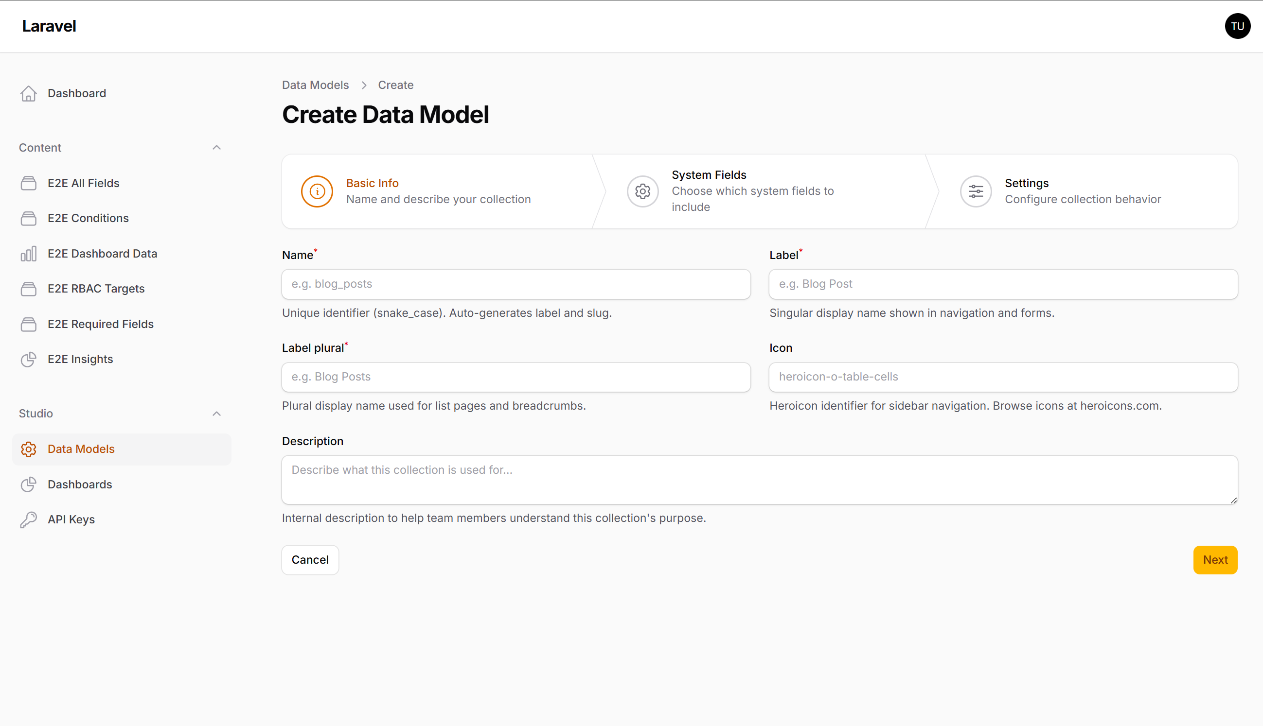 Create and manage data collections with custom fields through the admin UI. Each collection gets a fully functional CRUD interface with forms, tables, and filters — generated dynamically from the field definitions.