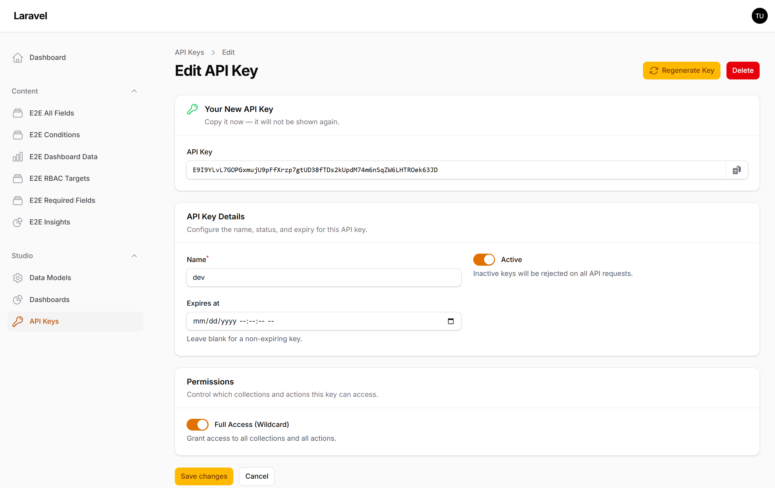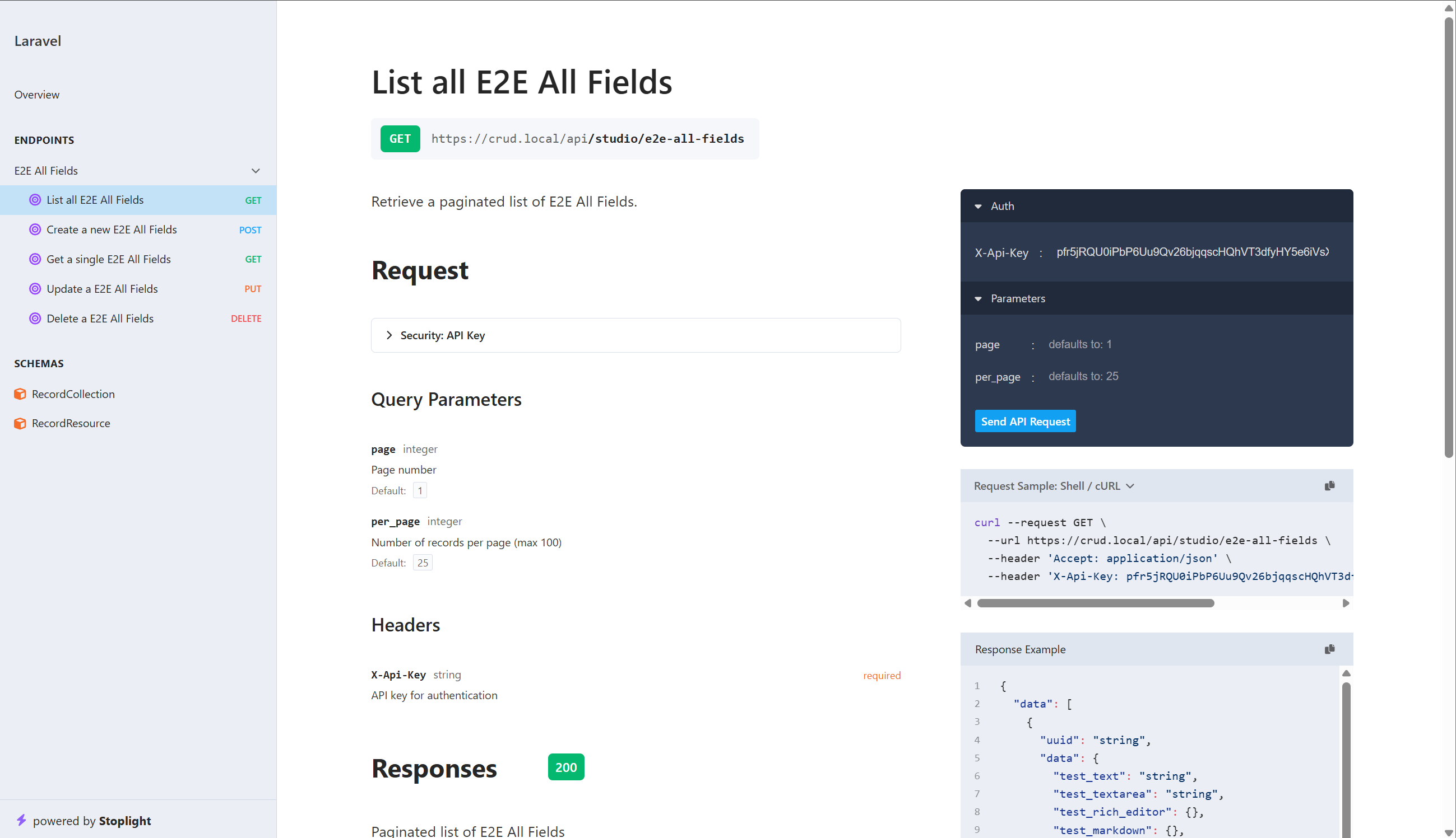 Auto-generated RESTful API with API key authentication, per-collection permissions, rate limiting, and OpenAPI documentation via Scramble.