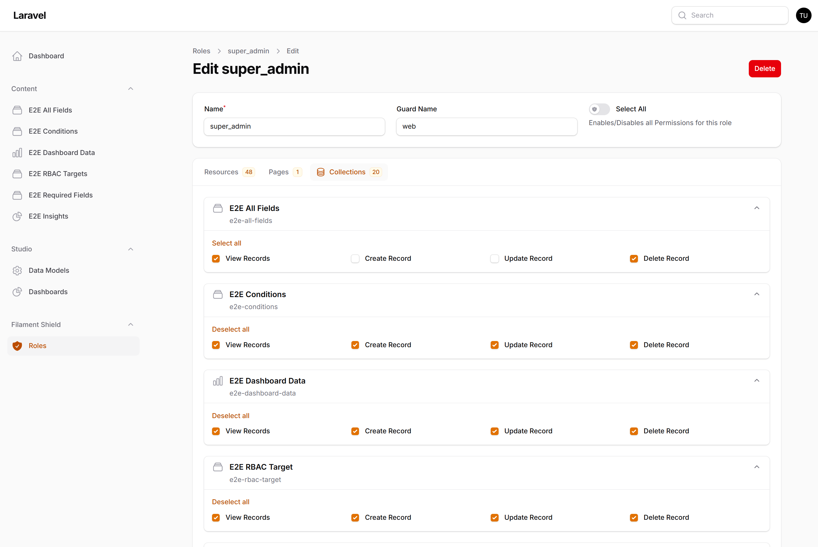 Policy-based access control with granular per-collection permissions. When spatie/laravel-permission is installed, Filament Studio automatically syncs permissions for each collection: