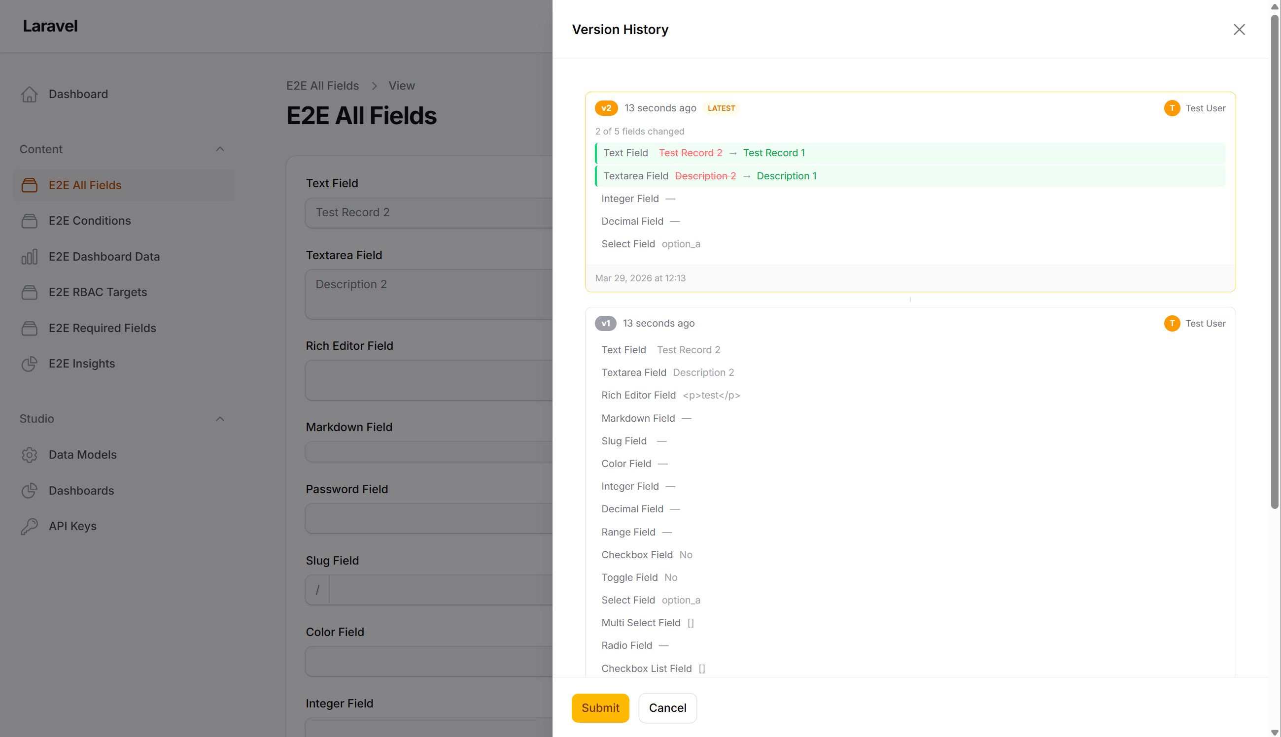 Optional snapshot-based version history with restore capability, including per-locale snapshots for translatable fields. Optional soft deletes to recover deleted records.