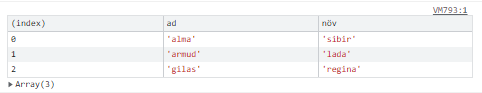 const meyve = [ { ad: "alma", növ: "sibir" }, { ad: "armud", növ: "lada" }, { ad: "gilas", növ: "regina" }, ]; console.table(meyve);